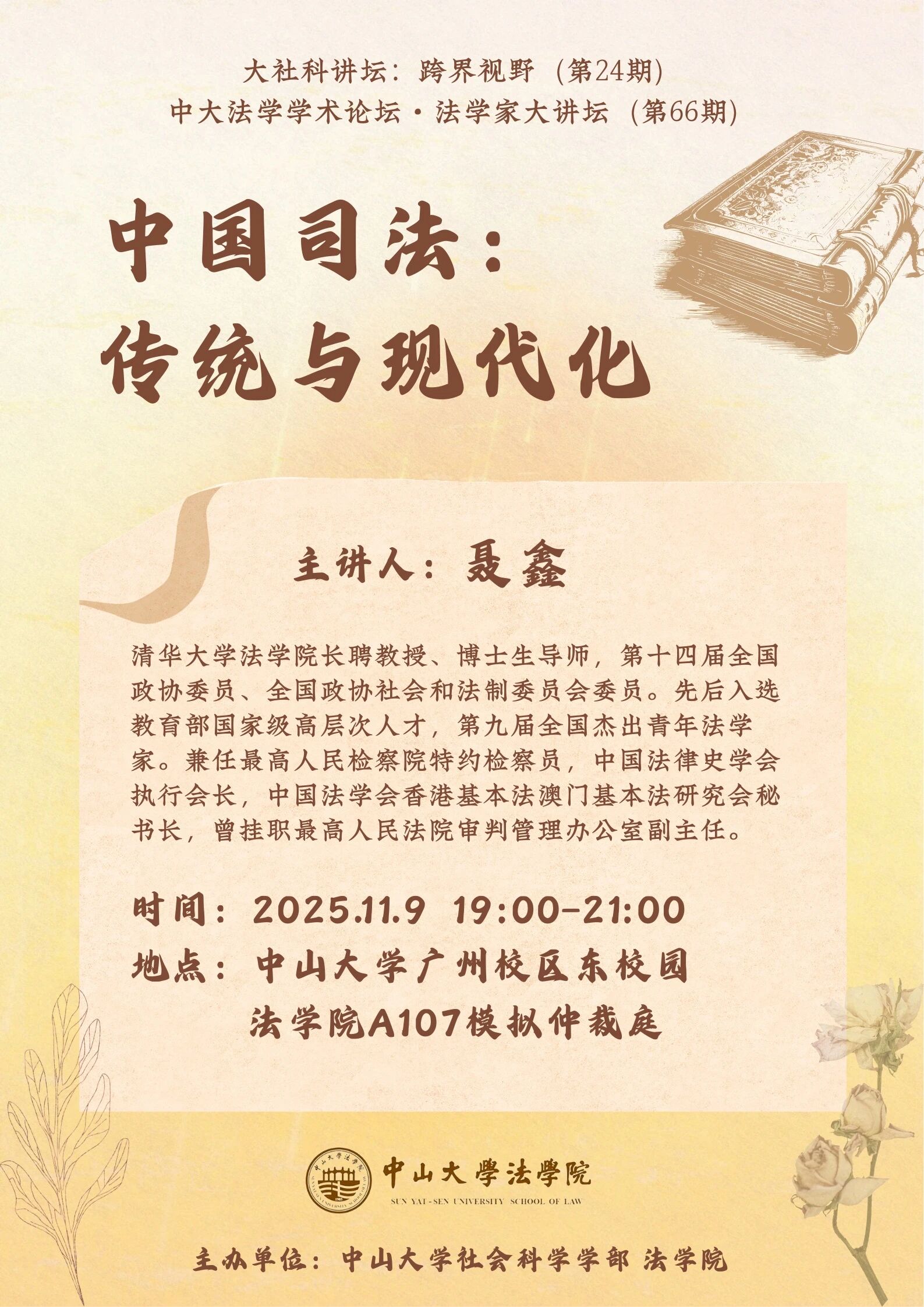 大社科讲坛:跨界视野(第24期)、中大法学学术论坛 • 法学家大讲坛(第66期)——中国司法:传统与现代化