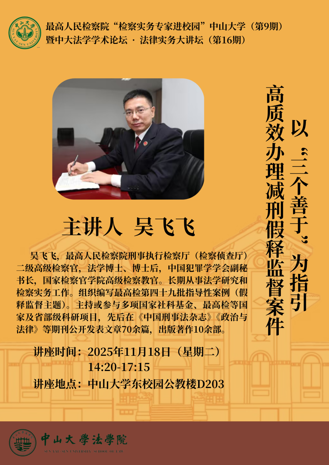 最高人民检察院“检察实务专家进校园”威廉williamhill(第9期)、中大法学学术论坛·法律实务大讲坛(第16期):以“三个善于”为指引高质效办理减刑假释监督案件