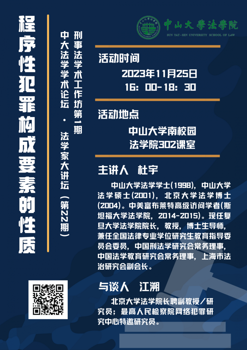【学术论坛预告】中大法学学术论坛 • 法学家大讲坛(第22期)刑事法学术工作坊第1期——程序性犯罪构成要素的性质